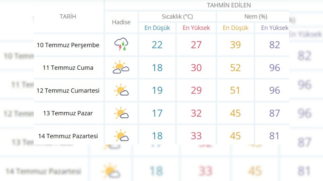 DMHA DÜZCE-Bölge genelinde güneşli ve açık bir hava beklenirken, özellikle gündüz saatlerinde yüksek sıcaklıklar yaşanacak.11–12 Temmuz tarihlerinde parçalı bulutlu ve ılık bir hava beklenirken, 13 Temmuz’dan itibaren sıcaklıklar 30°C’nin üzerine çıkacak. 15 Temmuz sonrası ise sıcaklıkların 33–34°C seviyelerine ulaşacağı tahmin ediliyor. Akşam saatlerinde ise 17–20°C arasında seyreden serin hava, özellikle yüksek kesimlerde konfor sağlayacak.Yetkililer, artan sıcaklıklar nedeniyle vatandaşları güneşin en dik geldiği 11.00–16.00 saatleri arasında dışarıda uzun süre kalmamaları konusunda uyarıyor.
