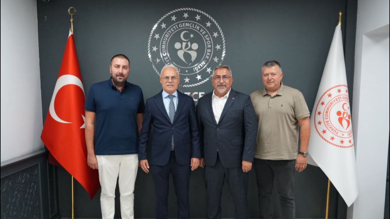 Düzcespor Kulüp Başkanı Mehmet Saygun, yönetim kurulu üyeleri Ertan Uçar ve Mert Cansu Coşkun ile birlikte Düzce Gençlik ve Spor İl Müdürü Zekeriya Arslantürk’e hayırlı olsun ziyaretinde bulundu.