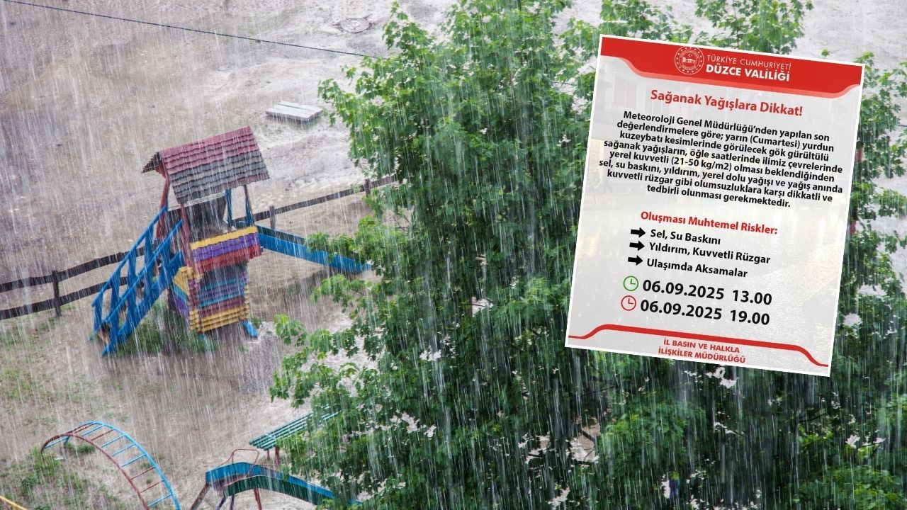 DMHA DÜZCE-Yapılan son değerlendirmelere göre, 6 Eylül Cumartesi günü öğle saatlerinden itibaren gök gürültülü sağanak yağışların etkili olması öngörülüyor. Yağışların özellikle 13.00-19.00 saatleri arasında yerel olarak kuvvetli (21-50 kg/m²) olacağı belirtilirken, Düzce Valiliği vatandaşları olası risklere karşı dikkatli ve tedbirli olmaya çağırdı.