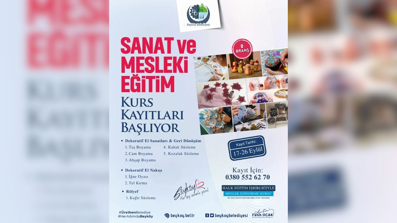 Beyköy Belediyesi, vatandaşların bilgi ve becerilerini geliştirmeye yönelik 2025-2026 dönemi Sanat ve Mesleki Eğitim Kursları için kayıtların başladığını duyurdu.