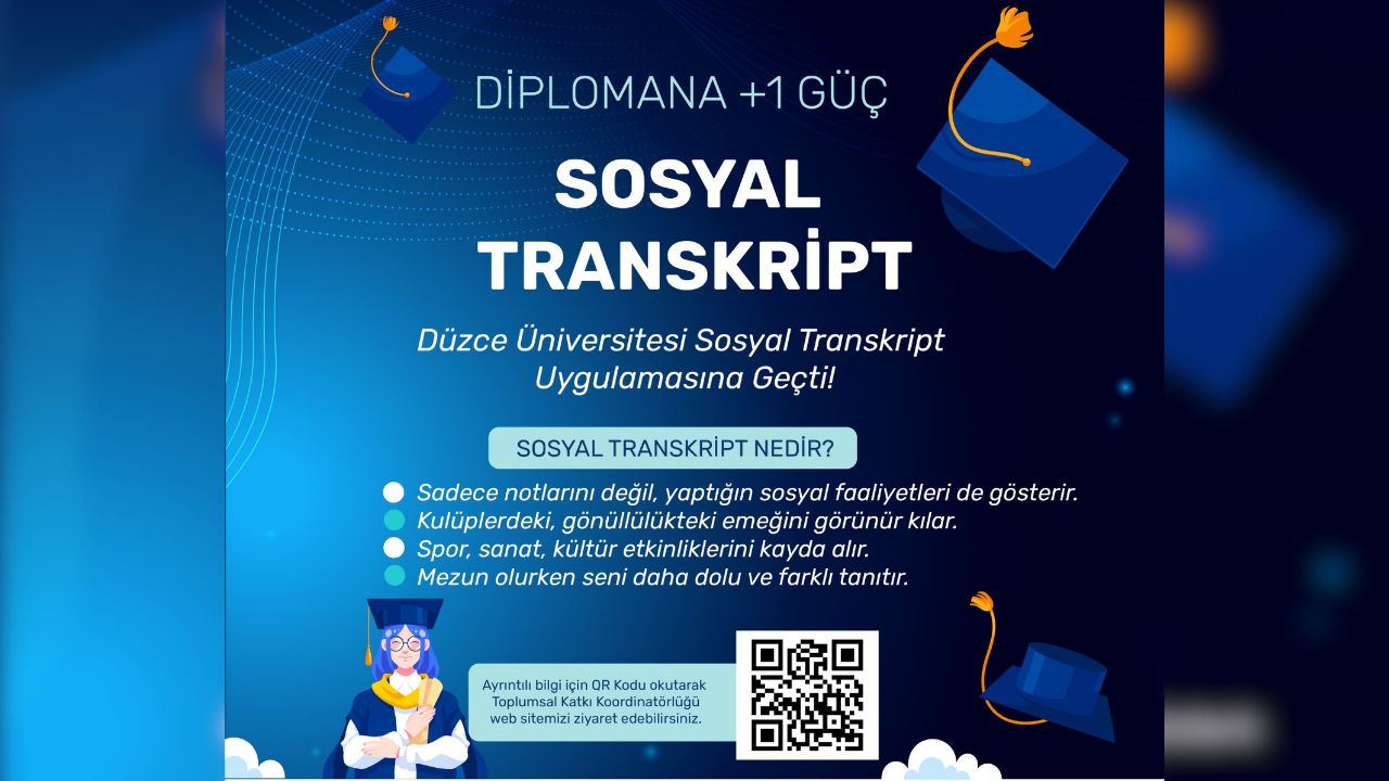 Düzce Üniversitesi Toplumsal Katkı Koordinatörlüğü, öğrencilerin akademik başarılarının yanı sıra sosyal, kültürel ve gönüllülük faaliyetlerini de görünür kılmak amacıyla Sosyal Transkript Uygulamasını başlattı.